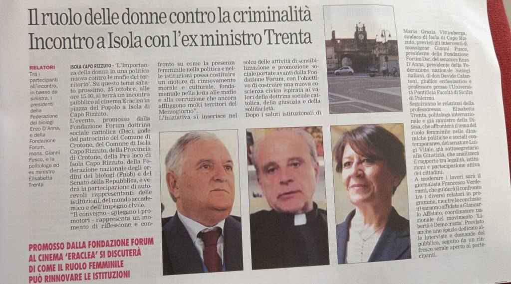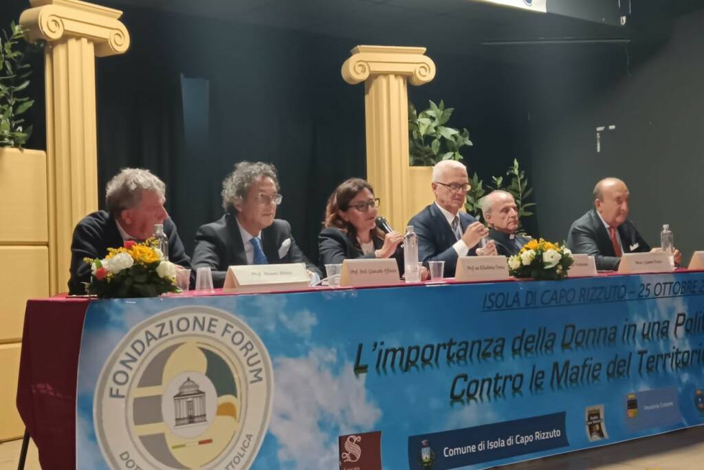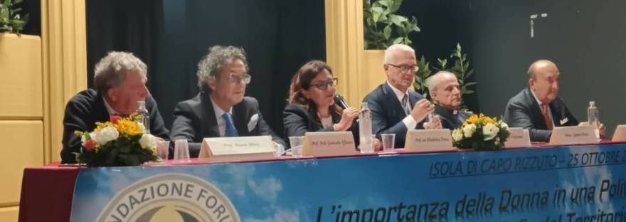 Discorso di Elisabetta Trenta al Convegno “𝐋’𝐢𝐦𝐩𝐨𝐫𝐭𝐚𝐧𝐳𝐚 𝐝𝐞𝐥𝐥𝐚 𝐃𝐨𝐧𝐧𝐚 𝐢𝐧 𝐮𝐧𝐚 𝐏𝐨𝐥𝐢𝐭𝐢𝐜𝐚 𝐍𝐮𝐨𝐯𝐚 – 𝐂𝐨𝐧𝐭𝐫𝐨 𝐥𝐞 𝐌𝐚𝐟𝐢𝐞 𝐝𝐞𝐥 𝐓𝐞𝐫𝐫𝐢𝐭𝐨𝐫𝐢𝐨” svoltosi a Isola Capo Rizzuto sabato 25 ottobre 2025, organizzato dalla Fondazione Forum della Dottrina Sociale della Chiesa e moderato dal giornalista Francesco Verderame. COn la partecipazione di Monsignor Fusco, del senatore Luigi Vitali, del professor Mauro Alvisi e del presidente di Libertà è Democrazia, Arch. Affatato.