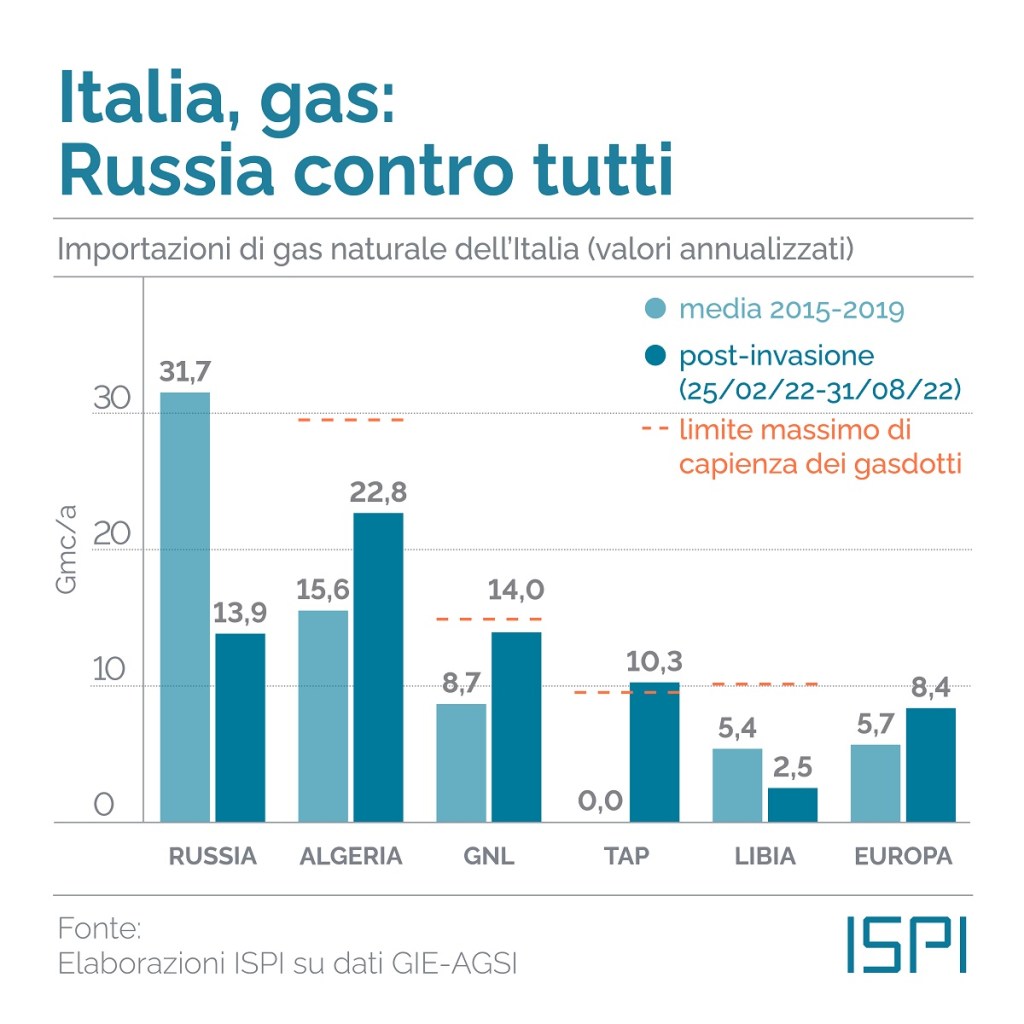 In Italia la dipendenza dal gas della Russia era circa il 45-50%. Come per l’Europa, al momento questo valore è sceso un po’ sopra al 15% mentre è aumentato l’export dall’Algeria che è diventata il primo fornitore.