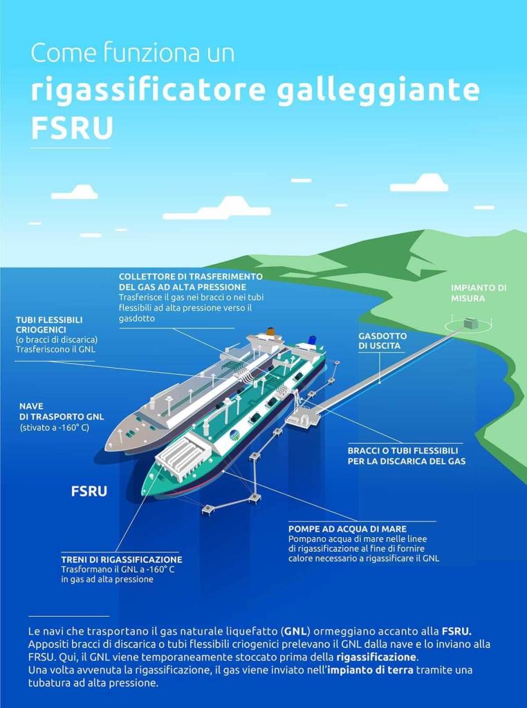 Per quanto riguarda i rigassificatori, e in generale i progetti energetici, in Italia sono sempre “variabili” trovando molta opposizione da parte della popolazione nel momento in cui devono essere collocati sul territorio. Gli impianti funzionanti sono tre,  La Spezia, Livorno e Rovigo. Ne sono poi previsti due di terra e due su nave. Quelli di terra sono Porto Empedocle (Agrigento, Sicilia), per il completamento del quale i finanziamenti sono stati sbloccati ad aprile 2022 e Gioia Tauro, e due galleggianti, con due navi da posizionarsi a Ravenna e Piombino, dove c’è grande opposizione perché la nave dovrebbe essere posizionata in porto.